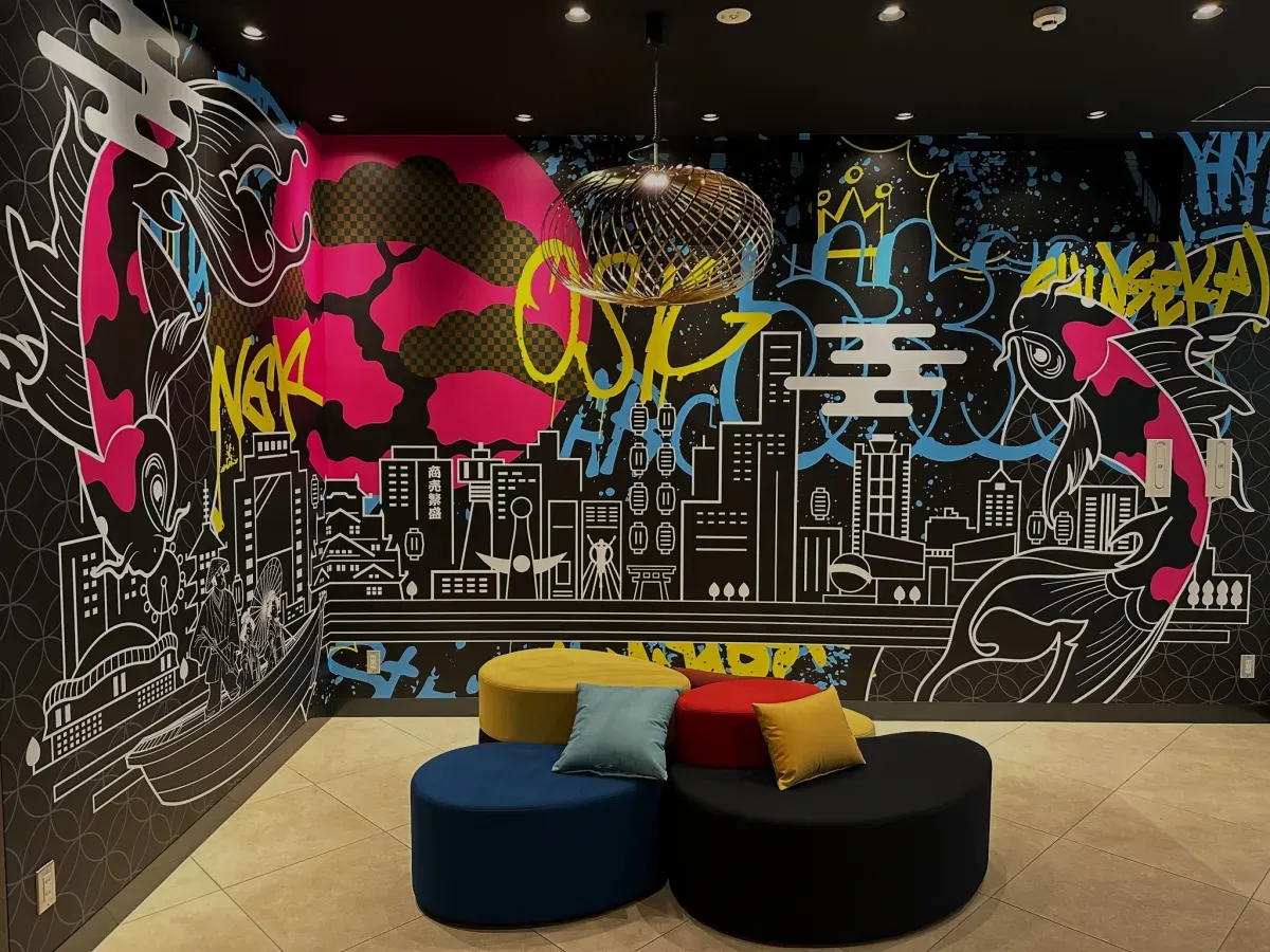 踏入飯店大廳,映入眼簾的是充滿心齋橋美國村的設計牆面,帶領旅人彷彿走進 70 年代的時光隧道般,使人能在這忘卻旅途的辛勞。